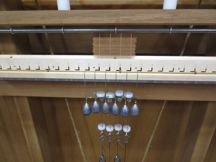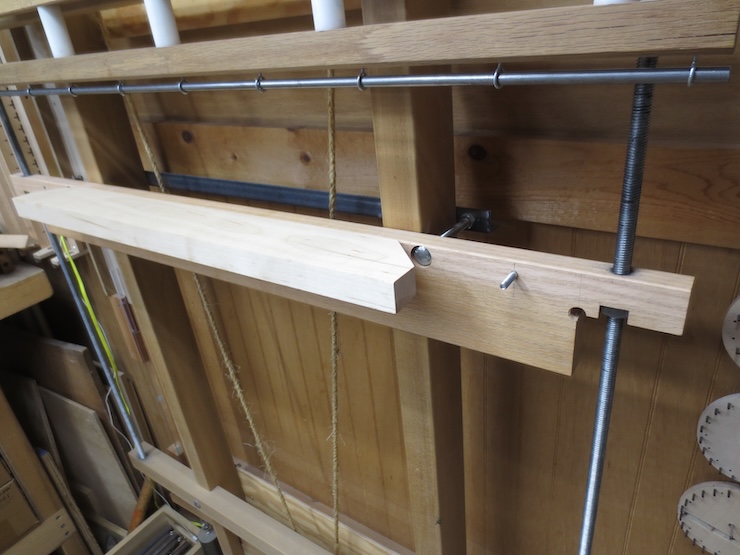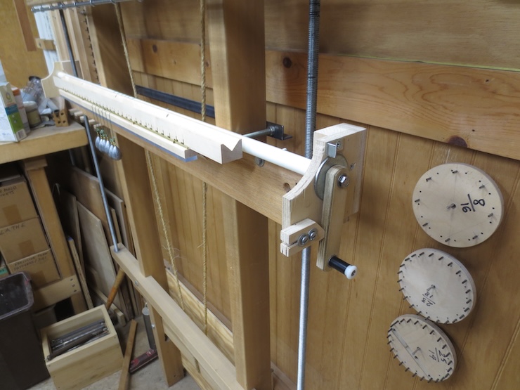 Pairs of small holes are placed at intervals along the front to secure a 1/8″ diameter brass rod there. This elevates each weighted cord at the front so that it won’t tend to cross over the previous wraps around the spindle. The cord starts low at the back and winds around the spindle in an ascending counter-clockwise spiral. After three turns it leaves the spindle higher up and is kept there by the height of the brass rod. The cords pass over the front of the rack and down where each is tied to a lead weight.