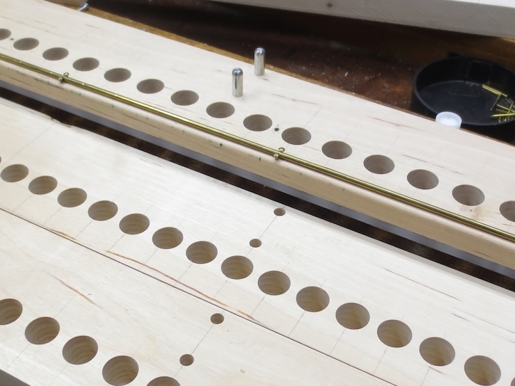 A brass rod is cut to length and fastened in place by escutcheon pins driven into the previously drilled holes.