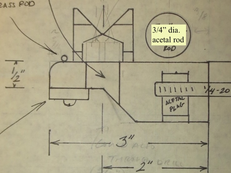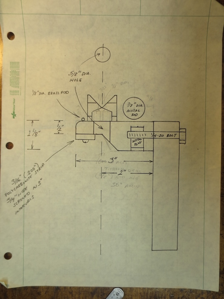 I made these two plastic parts to align the wire trough directly above the spindle rack while marking the small screw hole locations with a brad point drill as shown above. Careful measurement would also suffice. The centers of these barely started holes are carefully drilled to allow for the #4 screws.