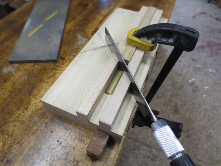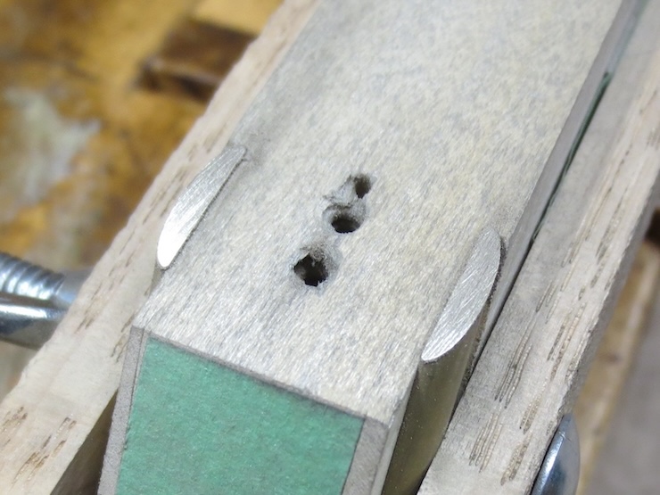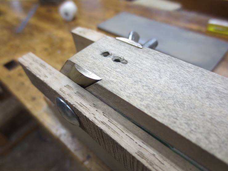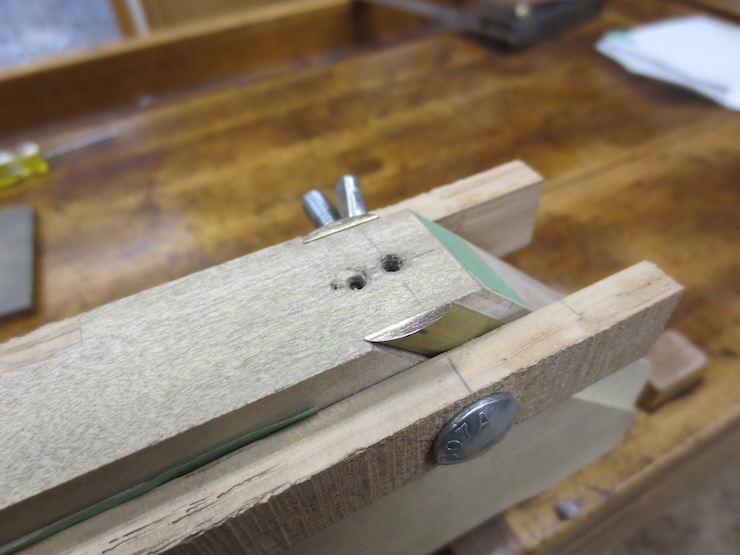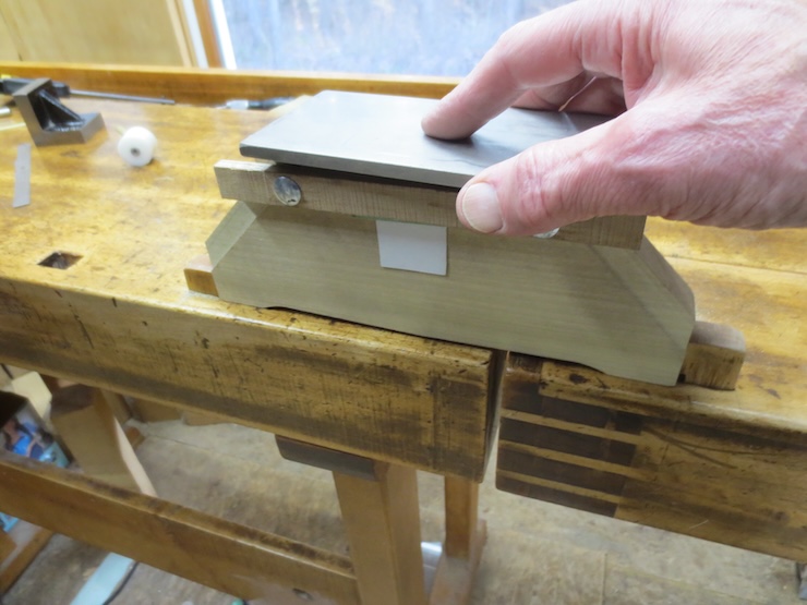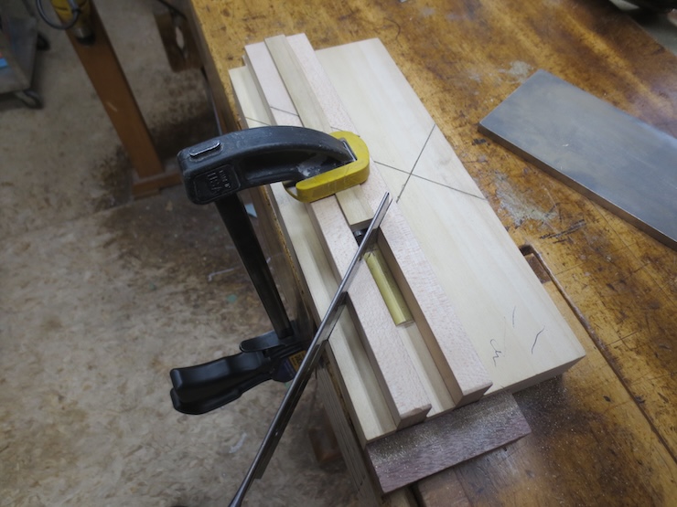 This is a jig that I made to lap the miters. Opposite sides of a single brace are placed in the jig and clamped in place; the far one can’t be seen here. The white plastic stop aligns the ends at the same height.