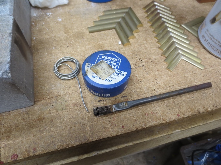 After experimenting quite a bit I found this paste flux to work best. I apply a thin layer to the freshly lapped miters while avoiding the top curved surfaces. (The price tag tells me that this tin of solder cost 65 cents and was purchased at a Coast to Coast hardware store. From these clues I deduce that it is about 45 years old.)