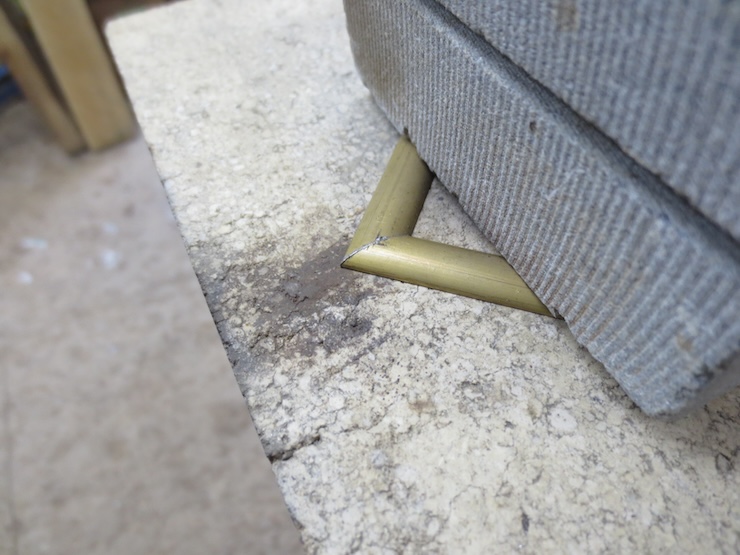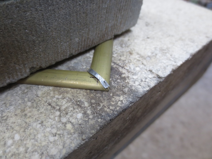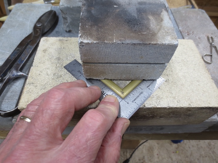 I have found three shapes of extruded brass that are suitable for making braces to protect the bottom corners of moulds. The largest size is a true half round 1/2″ wide and 1/4″ thick. The other two are roughly half oval. One is 1/2″ wide and about 1/8″ thick and the other 3/8″ wide by 3/32″ thick.