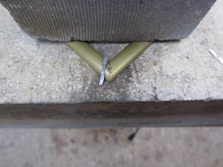 (After the joint is soldered the parts go out of square by a fraction of a degree. I think that when the solder flows in it widens the joint just a bit. This causes each half to pivot very slightly at the spot where the upper brick is holding it down. This makes the final angle of the braces very slightly sharper than 90 degrees. Aligning the parts with a slightly obtuse gauge (rather than the one shown) might correct this though the error is too slight to be a real problem.)