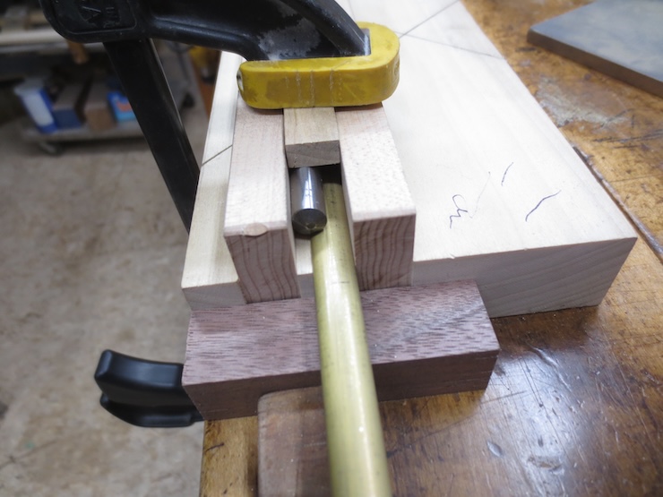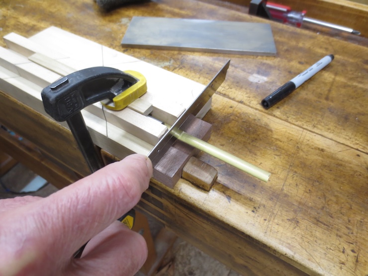 A piece of drill rod pushes the narrower 3/8″ stock against the back fence when clamped. The two wider sizes fit snugly between the fences but are also clamped using the same arrangement.