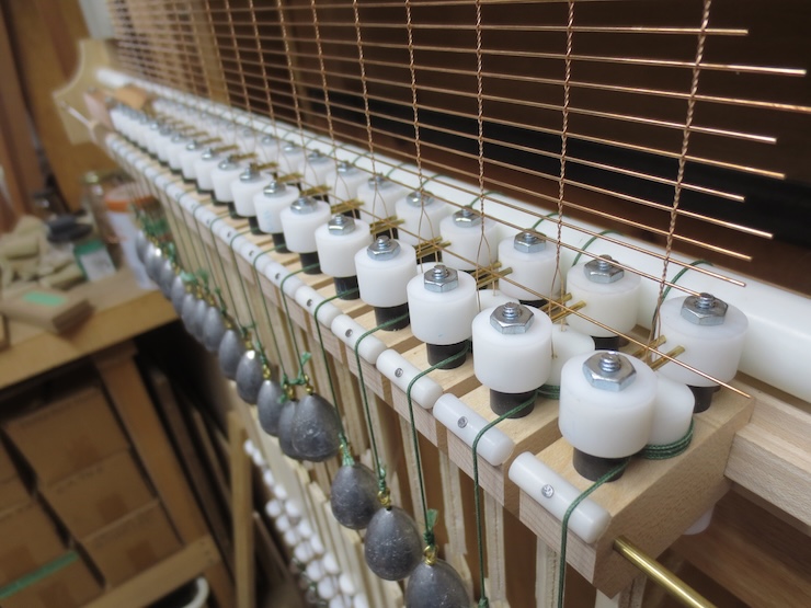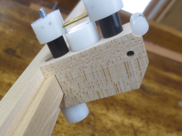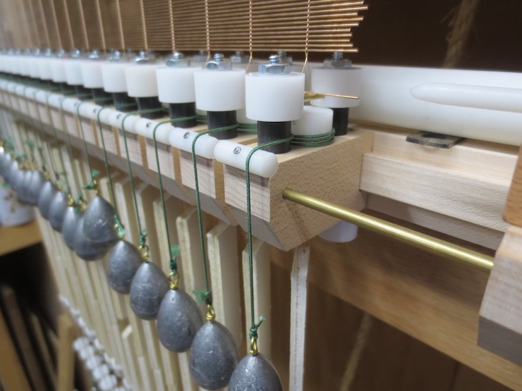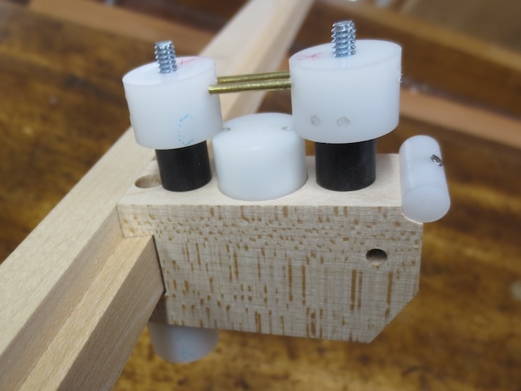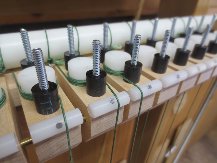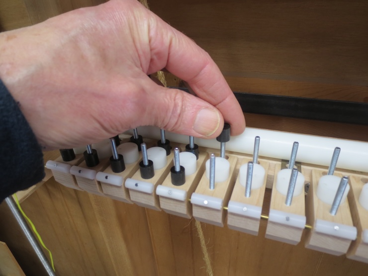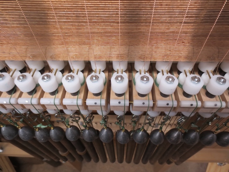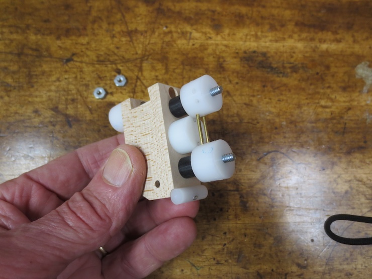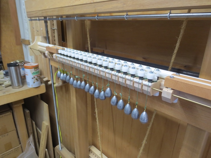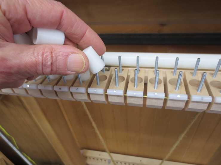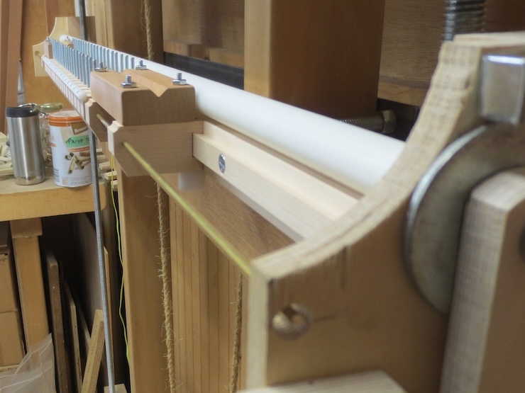 This is one of a number of spindle units that make it possible to create any spacing between chain wires. One of these is required for each pair of chain wires. The minimum (3/4″) is limited by the width of these wooden parts. But this doesn’t matter because it’s still a little closer than is possible with the weights and wire slides that this loom uses.