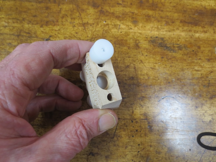 After all the spindles are in place the mould frame part is removed. A brass rod is passed through all of the spindle units to add an extra bit of security. If one unit should work loose it will still be held in place by its neighbors (though I haven’t found this to be a problem yet). These holes are drilled .003″ larger than the 1/8″ brass rod so it can easily be fed through by hand. It was more convenient to use two segments of rod. One was inserted from each end, placing the joint within one of the spindle units.