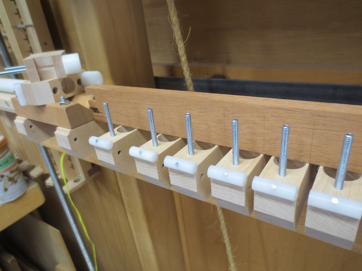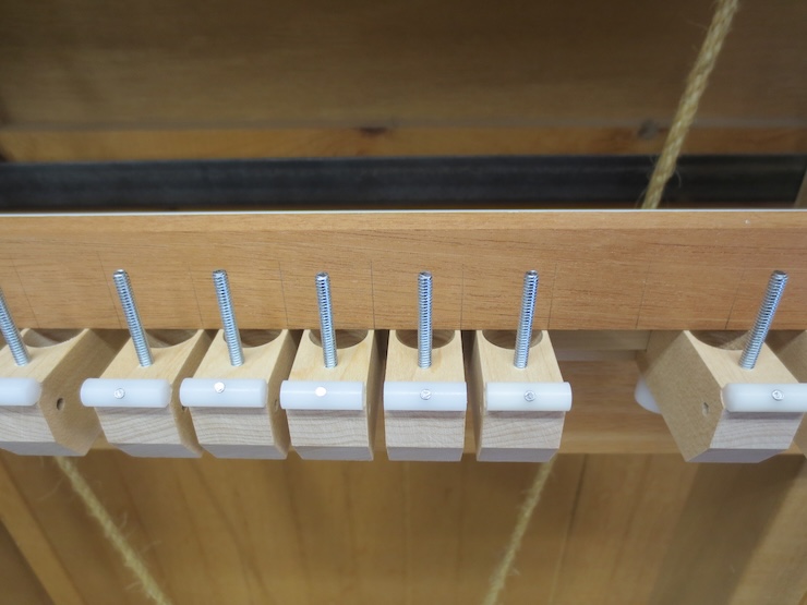 When making backing the shuttle rest needs to be elevated to match the higher support rods so the shuttle can slide evenly onto them. Here four 1/8″ thick nuts have been placed (not threaded) over the steel studs to lift the shuttle rest. I’ll make fitted shims in the future to make this easier.
