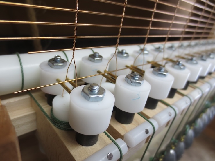 The units clamp to a wooden rail which is screwed to the traveling beam of the loom. A wooden wire trough (as with the previous spindle racks) is no longer needed. Instead a pair of 1/16″ brass rods held in place by plastic cylinders bridge the gap over each spindle to support laid wires as they are added. The wire supports can be placed in two positions, high or low. Here the pair of brass rods are high above the spindle to shape the more gradual twists of the widely spaced backing wires.