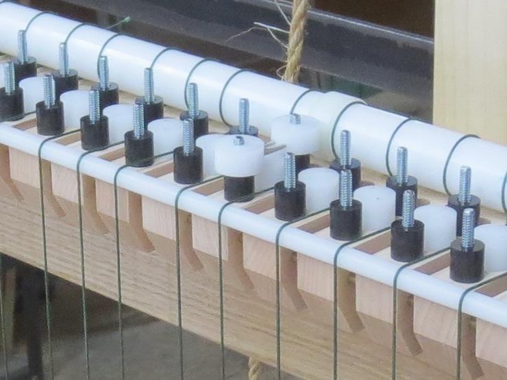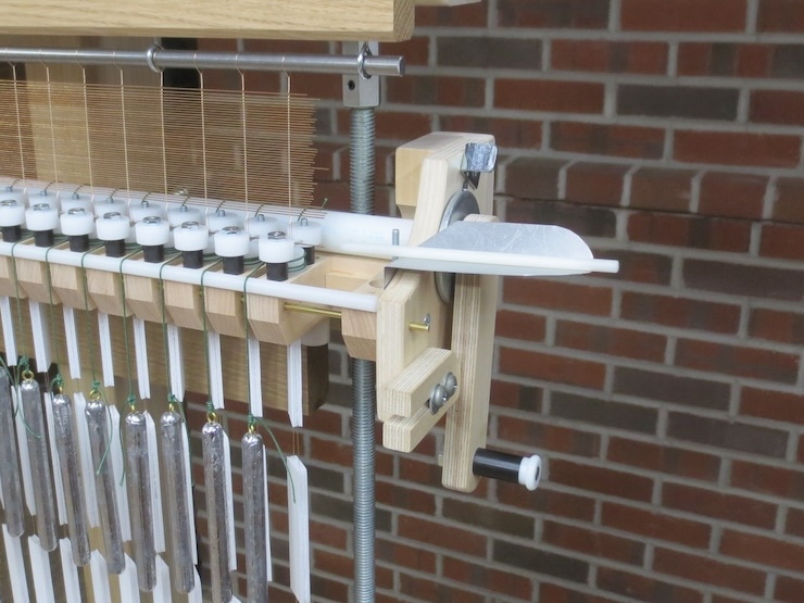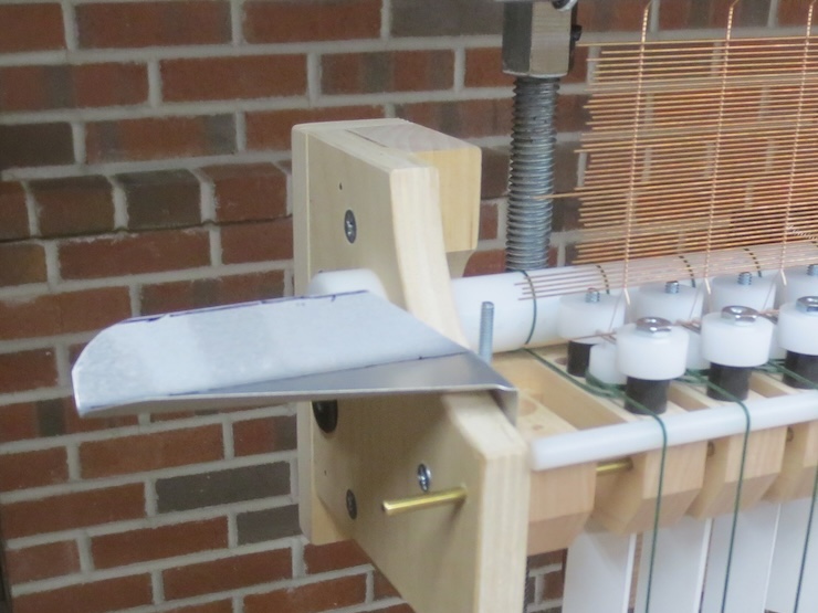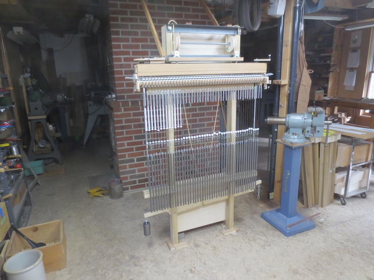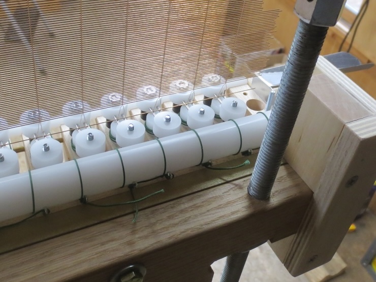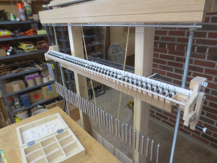 Now the chain wires are being strung and wire weights added. The lift beam tilts up on the right due to the uneven weight (so far). These new ‘skinny’ wire weights are 1/2″ diameter and 18″ long. They weigh the same as the older 3/4″ x 8″ ones. The two shapes have advantages and disadvantages. The thinner, longer weights are easier to use with closely spaced chain wires but put a smaller limit on the width of the facing (unless I cut a slot in the floor so they can hang down lower). I think the maximum width may be reduced to about 20″ . The loom frame is designed for a maximum width of about 29 inches. It’s not likely that ‘ll be making a mould that wide. (Keep in mind that the ‘width’ of the facing is measured vertically when it’s being made on the loom.)