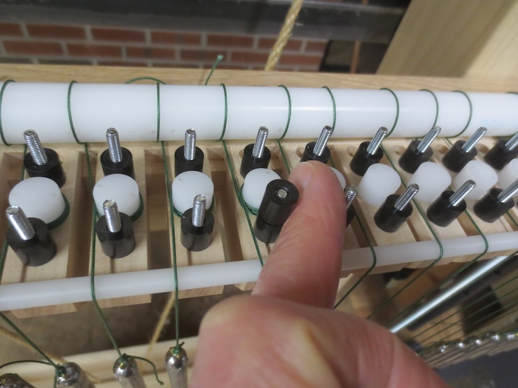Wrapping the drive cords requires some fancy finger work. The steel studs threatened to abrade the back of my finger and I found that adding an extra black plastic spacer created a much more comfortable situation. You just move the little tube along as you move from spindle to spindle.