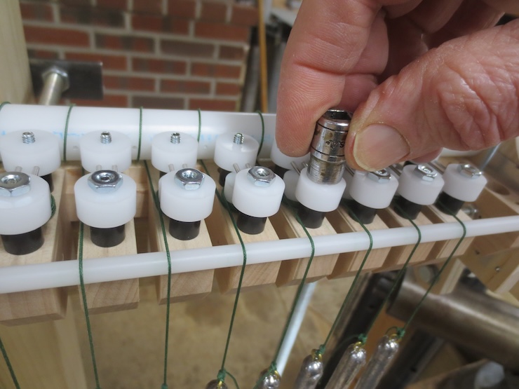 The forty-five 2-1/2 ounce drive weights pulled pretty hard on the cord reel. I temporarily placed three of the wire support assemblies (one shown here near the middle) along the length of the traveling beam. A short plastic bushing rides against each of these and holds the reel up so the drive cords don’t rub. These bushings are a new discovery and work very well. The wire supports aren’t usually put on until after the cords are wrapped around the spindles.