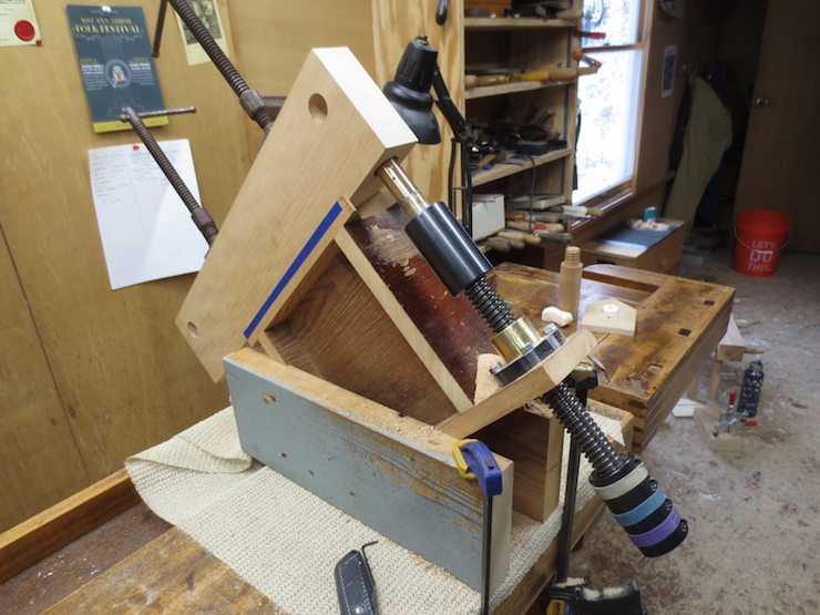 This plate aligns the press while it is clamped to the tapping frame and is then removed. This photo was taken before it occurred to me to tilt the tap 45 degrees.