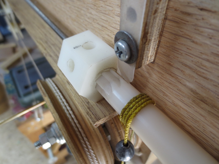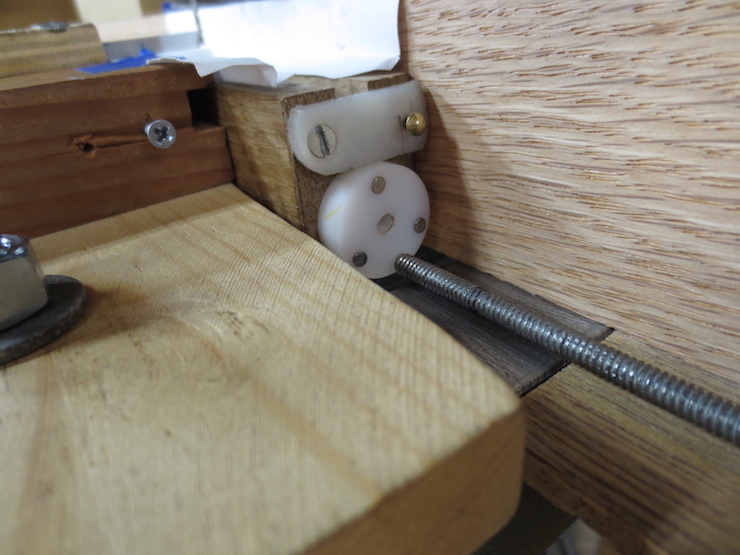 The lead screw is a standard threaded rod with 24 threads per inch. This ratchet has 8 teeth so one ‘click’ pulls the lead screw 1/192 of an inch. A weighted cord drives the ratchet spindle a set number of clicks to advance the lead screw a precise amount before each hole is drilled. The inner wooden wheel has a movable stop that regulates this. There are 6 different settings to drive the ratchet, from 39 clicks (13/64″ on center, the widest spacing) to 21 clicks (7/64″, the closest spacing).
