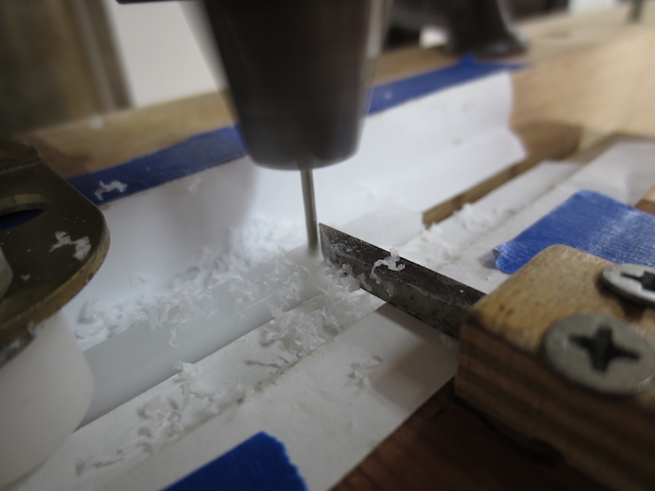 A Signature Punch comes with a set of six acetal pin strips, each with regularly spaced, closely drilled holes. For each tool there are about 660 holes in total that need to be drilled. This machine does most of the work. It takes 64 minutes to complete a strip with the closest spaced holes (7/64″ on center) and 34 minutes to drill the strip with the widest (13/64″ on center). The machine can be left alone to run and shuts itself off when a strip is completed.