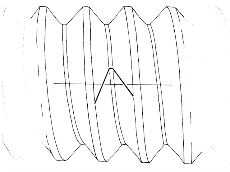 Metal screws are cut with a scraping action. The face of the cutter is set at or near the center line of the rotating screw blank. I have tried to illustrate this on the right in the illustration above. The radiating lines represent stages of the cut (every 10 degrees) to help visualize the shape of the face of the thread that is created. On the left I show the slicing/shearing action that forms a wooden screw thread. Again the stages of the cut are indicated by the radiating (but slanted) lines. When examining the finished screws, in either case you would be able to lay a straight edge along one of these (imaginary) lines showing no gap. But because the wooden threads were cut with an angled, slicing cut they will be slightly hollow when viewed from the side. The drawing below is exaggerated to show this effect.
