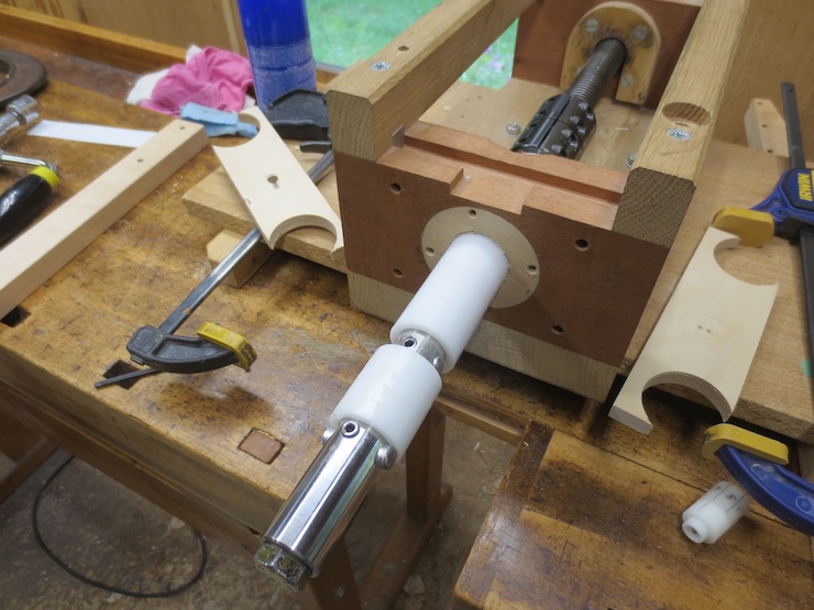 In this view from above you can see how bushings are stacked along the shaft between the cutter and the shaft connector. Four are needed between the black shaft connector and the tap cutter and one more is hidden inside the wooden press jaw.
