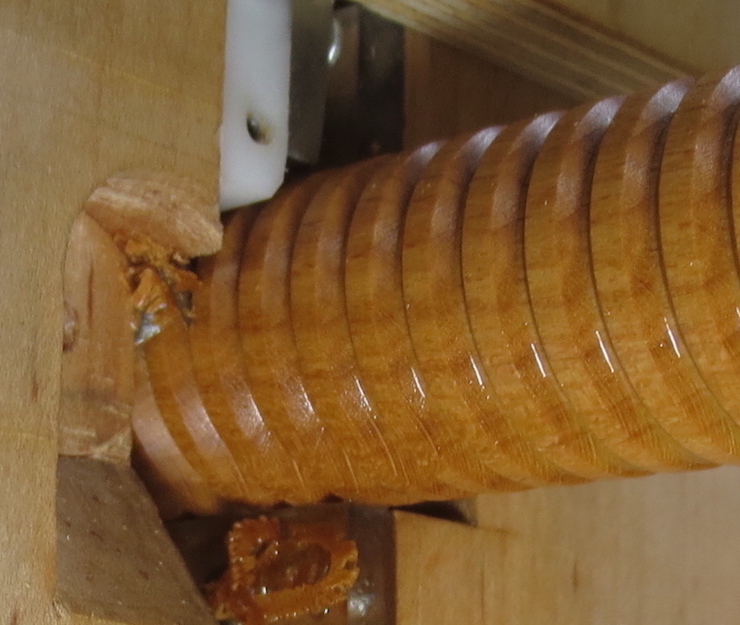 The screw has been backed off a little to show the V-shaped shaving. Thinned raw linseed oil is applied to the screw while the thread is being cut. This softens and lubricates the wood and helps the cutter stay sharp much longer.
