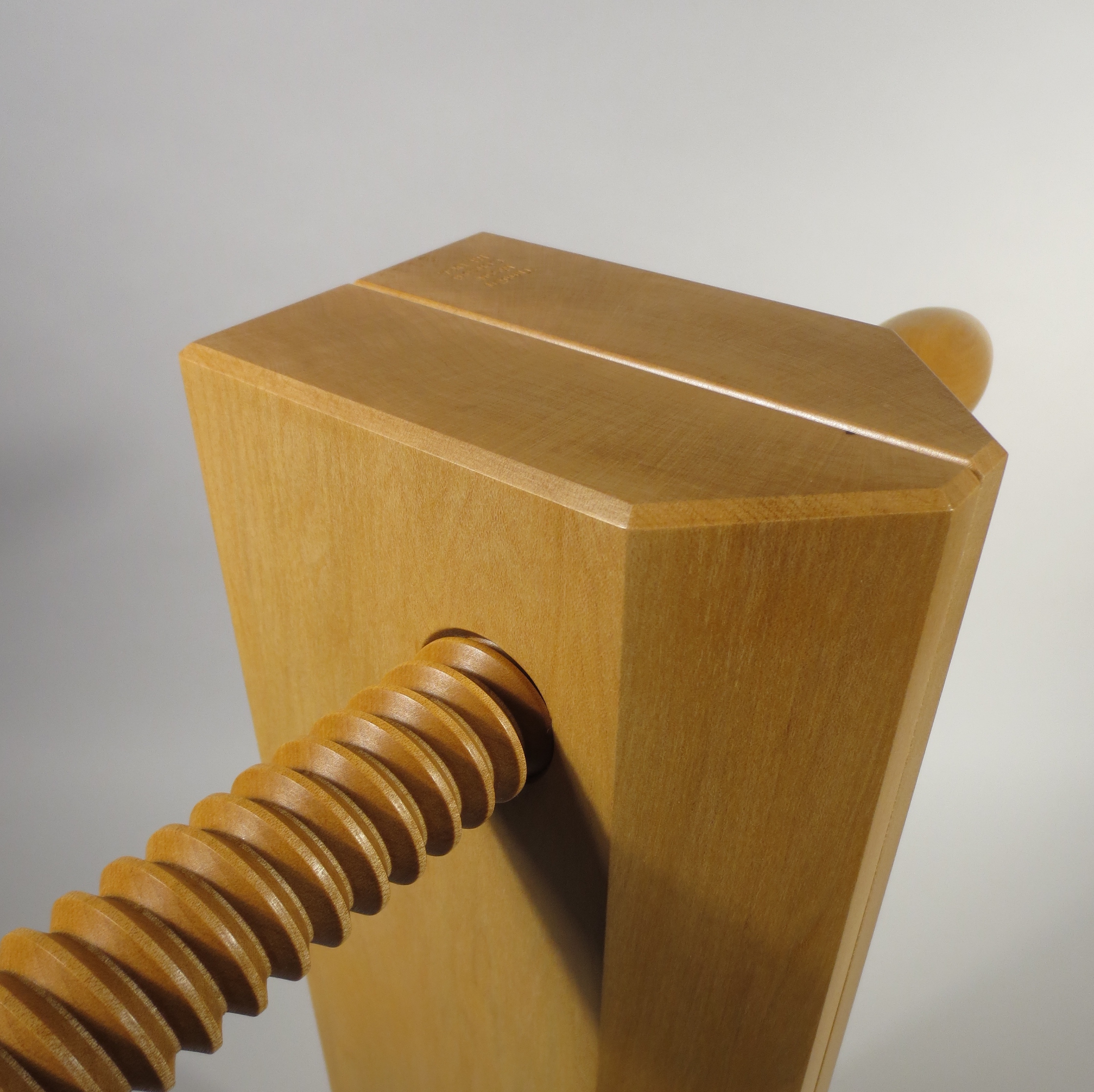 These presses have wooden screws cut by hand using shop made taps and dies. Though carefully and cleanly cut, the threads are coarse; this has several benefits. Large, coarse threads are ‘fast’; it only takes three or four turns to open or close a press an inch. Also, since they can be made with a looser fit they will not seize up with seasonal humidity changes. Visit the other menu links to see what presses I have made and to get some information about the processes used to make these tools.